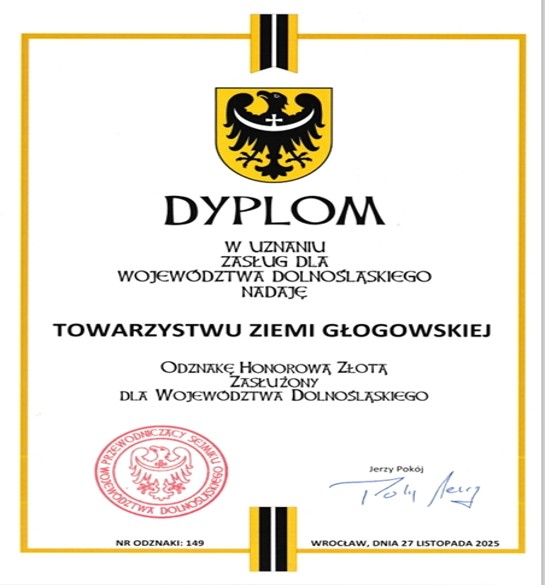 Sejmik Województwa Dolnośląskiego z okazji Jubileuszu 80 lecia działalności ruchu regionalistycznego w Głogowie przyznał Odznakę Honorową Złotą Zasłużony Dla Województwa Dolnośląskiego dla Towarzystwa Ziemi Głogowskiej.