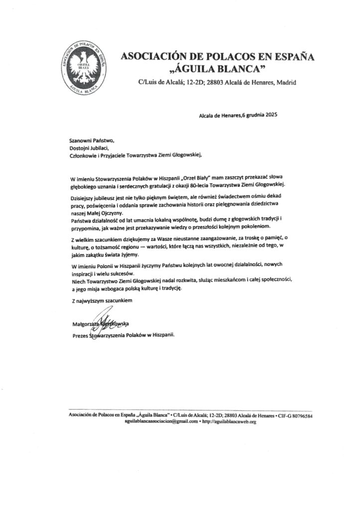 Specjalne życzenia od wielkiego sympatyka i Przyjaciela Towarzystwa Ziemi Głogowskiej wpłynęły do uczestników Gali Jubileuszu od Prezes Stowarzyszenia Polaków w Hiszpanii „Orzeł Biały” – Honorowej Obywatelki Miasta Głogowa Pani Małgorzaty Kierzkowskiej.