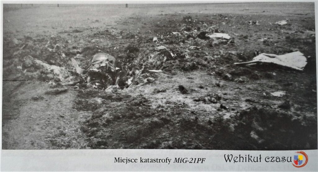 Miejsce upadku samolotu MiG 21pf na polu pod Pęcławiem (Fot. z księgi – „Pamięci Lotników Wojskowych 1945-2003, praca zb. pod redakcją ppłk. nawig. dr. Józefa Zielińskiego)