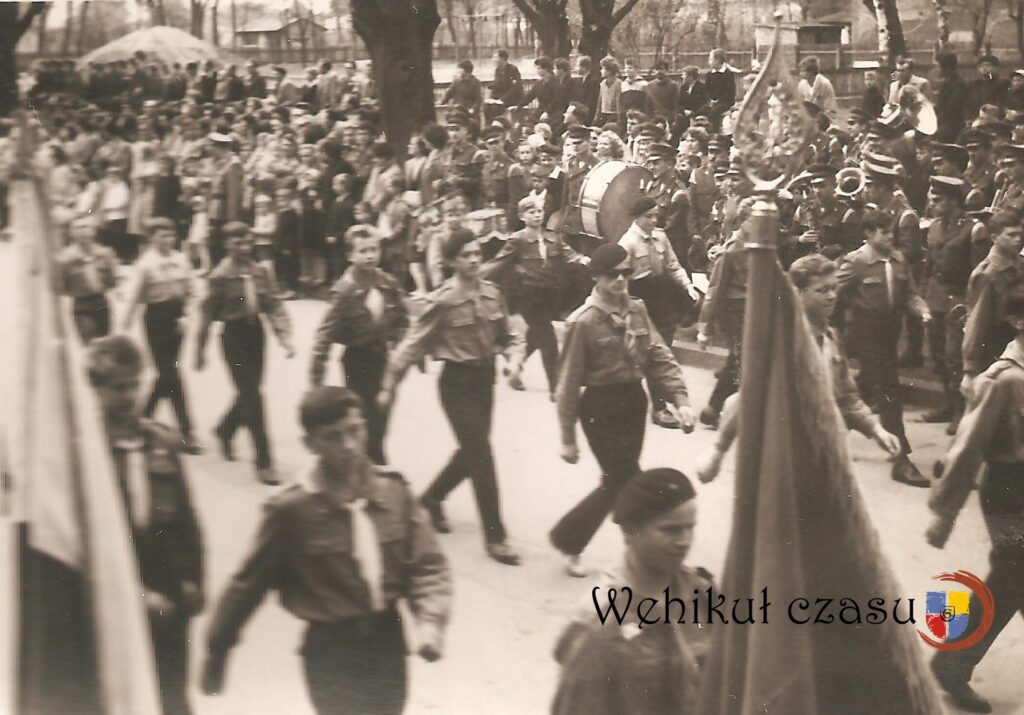 Głogowscy harcerze w 1959 r., w trakcie obchodów 850. rocznicy Obrony Głogowa. Defilada Harcerska na ul. Jedności Robotniczej. W głębi widoczna „górka” na nieistniejącym już placu zabaw. A na drugim zdjęciu harcerskie obozowisko zlotowe nad Odrą. [Z Kroniki Komendy Hufca]
