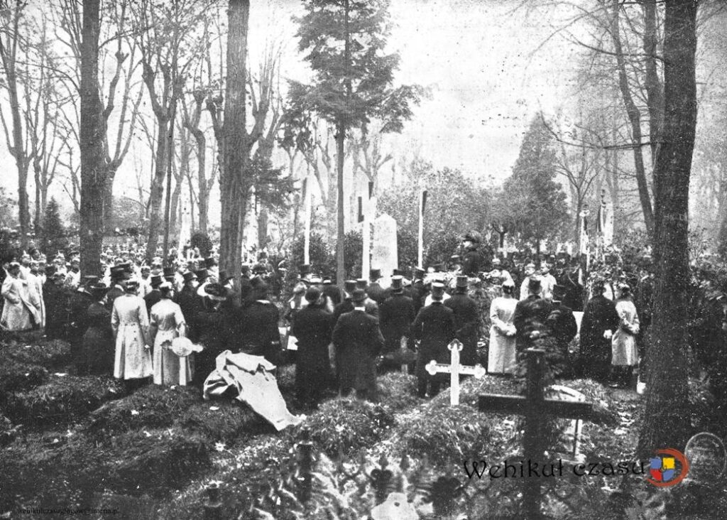 Ówczesna uroczystość na głogowskim cmentarzu garnizonowym – mieszają się białe płaszcze i pikielhauby oficerów i generalicji z cylindrami i melonikami cywilnych dygnitarzy. (Fotografia zamieszczona w śląskim periodyku z epoki (Schlesien, 1910/11 reprodukowana w: W. Maciuszczak, Twierdza Głogów, garnizon i ludzie, Głogów 2009)